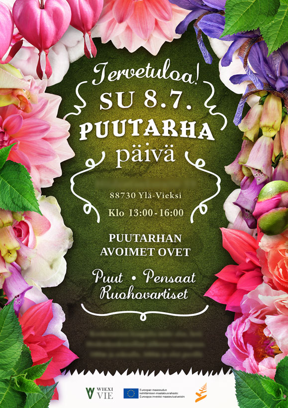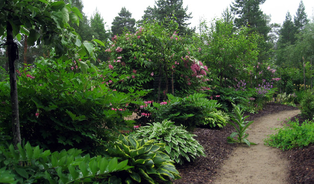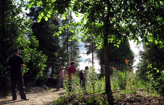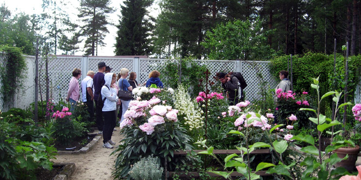 Puistomaisessa kohteessa tutustuttiin niin ruohovartisiin kuin puihin ja pensaisiin. Alppiruusujen paras aika oli juuri mennyt ja pionien vasta alkamassa, mutta näkemistä silti riitti. Kymmenien syreenien muhkeat tertut nuokkuivat kannattelemansa veden painosta. Todettiin, että kainuulaiset luonnonkasvit sopivat mainiosti puutarhaan. Valkolehdokin tuoksu on hurmaava ja suopursu on alppiruusu. Timo Niskanen kertoi kokemuksistaan puuvartisten kasvien menestymisestä. Hämäläiset kynäjalavat pärjäävät pakkasten puolesta erinomaisesti kuten myös pohjoisamerikkalainen mustasaarni. Puutarhurit Marjukka Piirainen ja Urho Kähkönen edustivat asiantuntemusta. Voidaan ennakoida, että Wiexi Vie -hankkeessa siitä saadaan vielä jatkossakin iloita.