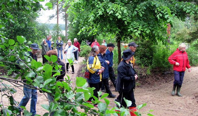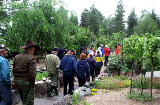 Hyvän voinnin hakua puutarhasta jatkettiin Ylä-Vieksillä. Että osattiinkin osua onnekkaasti koko päivän ropisseen sateen tauon kohtaan. Puutarhasää oli lopulta vallan erinomainen, vaikka aamulla näytti jo peruutuksen paikalta. Väkilaskuriin kertyi noin 60 kiinnostunutta. Sen verran moni oli ilmoittanut joutuvansa jäämään pois, että päätettiin järjestää uusintakierros.